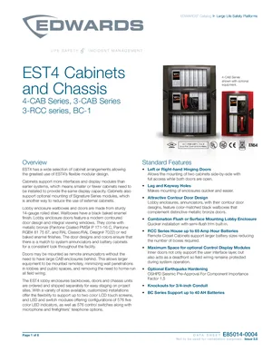 Datasheet for the Edwards EST4 Cabinets and Chassis, published in 2020. Document No: E85014-0004, Rev: Issue 3.0. 42 models including 3-CAB5B, 3-CAB7B, 3-CAB14B and 39 additional variants. Detailed technical specifications, electrical ratings, and agency listings.
