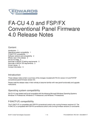 Manual for the Edwards EST FA-CU and FSP/FX Release Notes, published in 2017. Document No: 3102540-EN, Rev: 001. 8 models including FA-CU, FSP, FX and 5 additional variants. System overview, features and capabilities, and basic operation.
