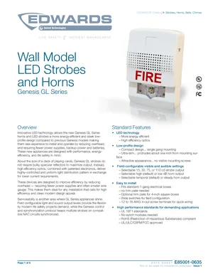 Datasheet for the Edwards EST Genesis GL Series, published in 2018. Document No: E85001-0635, Rev: Issue 1. 17 models including GL1RF-HD, GL1RF-HDVMC, GL1RF-VMC and 14 additional variants. Detailed technical specifications, electrical ratings, and agency listings.