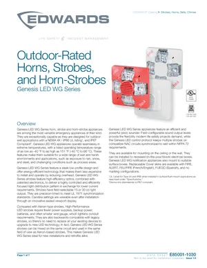 Datasheet for the Edwards EST Genesis LED WG Series, published in 2023. Document No: E85001-1030, Rev: 1.0. 30 models including WGARA, WGARF, WGARN and 27 additional variants. Product features, environmental operating limits, and compatibility data.