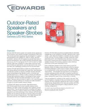 Datasheet for the Edwards EST Genesis LED WG Series Outdoor Speaker-Strobes, published in 2023. Document No: E85001-1031, Rev: 1.0. 20 models including WGSRA, WGSRF, WGSRF-FR and 17 additional variants. Engineering specifications, wiring diagrams, and mounting dimensions.