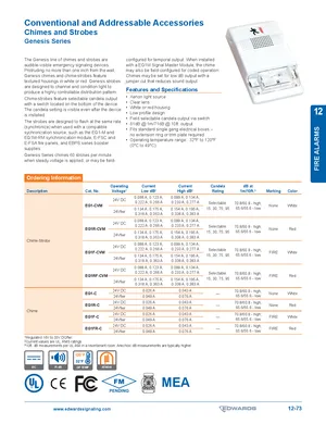 Datasheet for the Edwards EST Genesis Series Chimes and Strobes. Document No: 12-73. 8 models including EG1-CVM, EG1R-CVM, EG1F-CVM and 5 additional variants. Product features, environmental operating limits, and compatibility data.