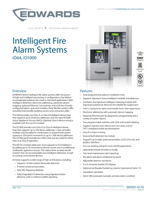Datasheet for the Edwards EST iO64 and iO1000, published in 2020. Document No: E85001-0135, Rev: Issue 1.5. 46 models including iO64, iO1000, IO1000G and 43 additional variants. Product features, environmental operating limits, and compatibility data.
