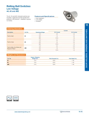 Datasheet for the Edwards EST Rolling Ball Switches. Document No: 11-15. Models 44, 45 and 46E. Detailed technical specifications, electrical ratings, and agency listings.