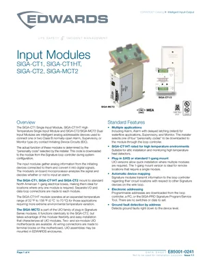 Datasheet for the Edwards EST SIGA-CT1 and SIGA-CT2, published in 2020. Document No: E85001-0241, Rev: Issue 1.1. 15 models including SIGA-CT1, SIGA-CT1HT, SIGA-CT2 and 12 additional variants. Product features, environmental operating limits, and compatibility data.