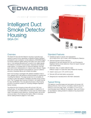 Datasheet for the Edwards EST SIGA-DH, published in 2020. Document No: E85001-0325, Rev: Issue 1.1. 15 models including SIGA-DH, SIGA-PS, SIGA-PHS and 12 additional variants. Detailed technical specifications, electrical ratings, and agency listings.