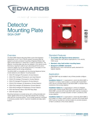 Datasheet for the Edwards EST SIGA-DMP, published in 2020. Document No: E85001-0255, Rev: Issue 1.1. 13 models including SIGA-DMP, SIGA-PD, SIGA-PHD and 10 additional variants. Product features, environmental operating limits, and compatibility data.