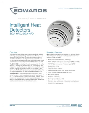 Datasheet for the Edwards EST SIGA-HRD and SIGA-HFD, published in 2023. Document No: E85001-0647, Rev: Issue 2.3. 19 models including SIGA-HRD, SIGA-HFD, SIGA-HRD-NL and 16 additional variants. Engineering specifications, wiring diagrams, and mounting dimensions.