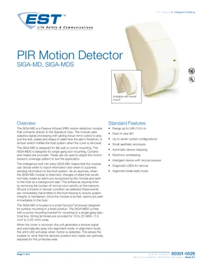 Datasheet for the Edwards EST SIGA-MD and SIGA-MDS, published in 2010. Document No: 85001-0526, Rev: Issue 3.1. Models SIGA-MD and SIGA-MDS. Detailed technical specifications, electrical ratings, and agency listings.