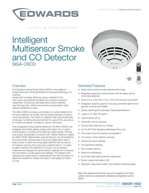 Datasheet for the Edwards EST SIGA-OSCD, published in 2020. Document No: E85001-1002, Rev: Issue 1.4. 17 models including SIGA-OSCD, SIGA-SB, SIGA-SB4 and 14 additional variants. Engineering specifications, wiring diagrams, and mounting dimensions.