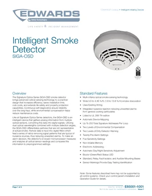 Datasheet for the Edwards EST SIGA-OSD, published in 2019. Document No: E85001-1001, Rev: Issue 1. 16 models including SIGA-OSD, SIGA-SB, SIGA-SB4 and 13 additional variants. Engineering specifications, wiring diagrams, and mounting dimensions.