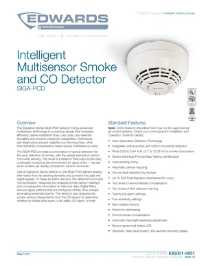 Datasheet for the Edwards EST SIGA-PCD, published in 2018. Document No: E85001-0651, Rev: Issue 1.2. 15 models including SIGA-PCD, SIGA-PCD-CA, SIGA-SB and 12 additional variants. Product features, environmental operating limits, and compatibility data.
