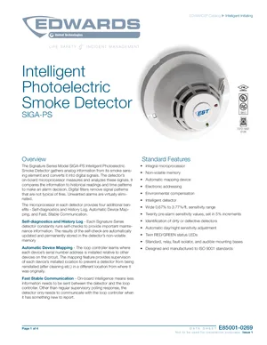 Datasheet for the Edwards EST SIGA-PS Photo Detector, published in 2018. Document No: E85001-0269, Rev: Issue 1. 15 models including SIGA-PS, SIGA-SB, SIGA-SB4 and 12 additional variants. Product features, environmental operating limits, and compatibility data.