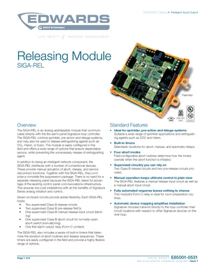 Datasheet for the Edwards EST SIGA-REL, published in 2018. Document No: E85001-0531, Rev: Issue 1. 21 models including SIGA-REL, 276A-REL, 278A-REL and 18 additional variants. Product features, environmental operating limits, and compatibility data.