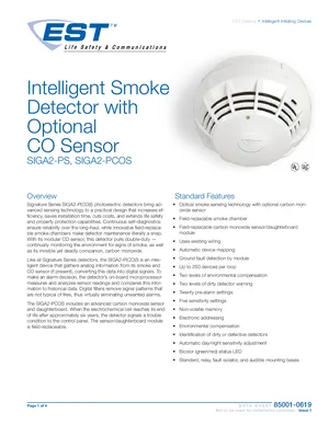 Datasheet for the Edwards EST SIGA2-PS and SIGA2-PCOS, published in 2010. Document No: 85001-0619, Rev: Issue 1. 18 models including SIGA2-PS, SIGA2-PCOS, SIGA2-PCOS-CA and 15 additional variants. Engineering specifications, wiring diagrams, and mounting dimensions.