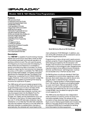 Datasheet for the Faraday 1460 & 1461 Master Time Programmers, published in 2004. Document No: 9300. 9 models including 1460, 1461, 1464 and 6 additional variants. Detailed technical specifications, electrical ratings, and agency listings.