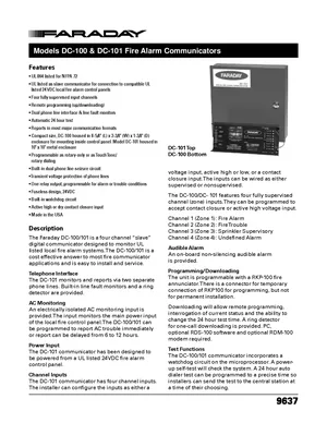 Datasheet for the Faraday DC-100 and DC-101, published in 2004. Document No: 9637, Rev: 9/04. 5 models including DC-100, DC-101, RKP-100 and 2 additional variants. Product features, environmental operating limits, and compatibility data.