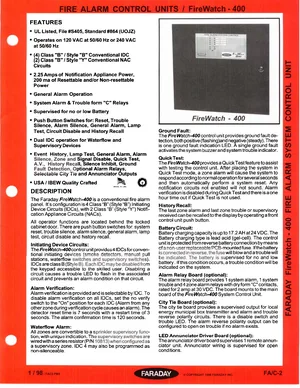 Datasheet for the Faraday FireWatch-400, published in 1998. Document No: FA/C-2. 13 models including FireWatch-400, FW-400, SFT-4 and 10 additional variants. Product features, environmental operating limits, and compatibility data.
