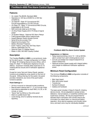 Datasheet for the Faraday FireWatch-4000, published in 1999. Document No: FA/C-2-5. 26 models including FireWatch-4000, FW-4000, 12400 and 23 additional variants. Product features, environmental operating limits, and compatibility data.