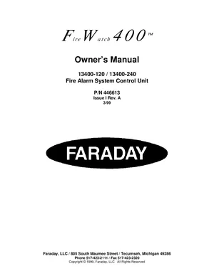 Installation and Operations Manual for the Faraday FireWatch 400, published in 1999. Document No: 446613, Rev: I A. 7 models including 13400-120, 13400-240, 13402 and 4 additional variants. System installation procedures and daily operating instructions.