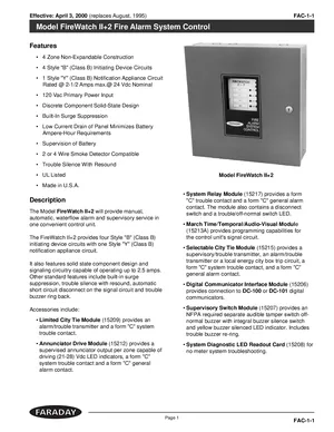 Datasheet for the Faraday FireWatch II+2, published in 2000. Document No: FAC-1-1. 14 models including FireWatch II+2, 15240A, 15207 and 11 additional variants. Engineering specifications, wiring diagrams, and mounting dimensions.