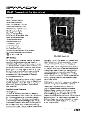 Datasheet for the Faraday LW-401, published in 2004. Document No: 9707. 18 models including LW-401, LifeWatch-401, LW-401R and 15 additional variants. Product features, environmental operating limits, and compatibility data.