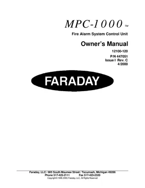Installation, Operations, and Programming Manual for the Faraday MPC-1000, published in 2000. Document No: 447051, Rev: Issue I C. 36 models including MPC-1000, 12100, 12100-120 and 33 additional variants. Mounting and wiring instructions, user operating guides, and system software setup.