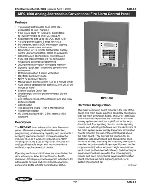 Datasheet for the Faraday MPC-1500, published in 2000. Document No: FAC-3-8. 22 models including MPC-1500, MPC-1500E, LSE-1 and 19 additional variants. Engineering specifications, wiring diagrams, and mounting dimensions.