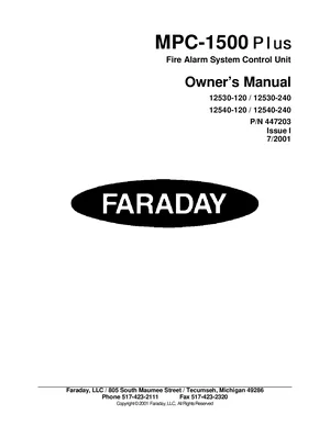 Installation, Operations, and Programming Manual for the Faraday MPC-1500 Plus, published in 2001. Document No: 447203, Rev: Issue I. 7 models including MPC-1500 Plus, 12530-120, 12530-240 and 4 additional variants. Hardware installation, alarm/fault management, and advanced system configuration.