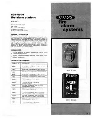 Datasheet for the Faraday Non-Code Fire Alarm Stations. Document No: FA-18. 13 models including 10010, 10012, 10014 and 10 additional variants. Engineering specifications, wiring diagrams, and mounting dimensions.