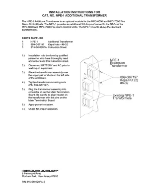 Installation Manual for the Faraday NPE-1. Document No: 315-049120FA, Rev: 2. Models NPE-1, MPC-6000 and MPC-7000. Physical installation guide, backbox dimensions, and cabling specifications.