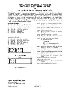 Installation and Wiring Diagram for the Faraday SLU-2 and SLE-16. Document No: 315-447345-2, Rev: 2. Models SLU-2 and SLE-16. Mounting instructions, terminal connections, and system wiring layouts.