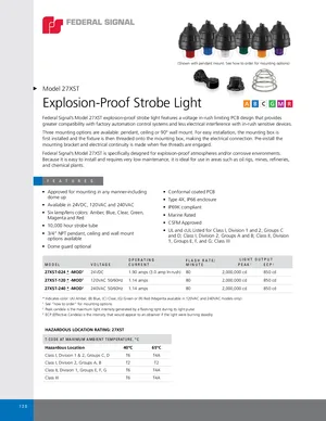 Datasheet for the Federal Signal 27XST. 4 models including 27XST, 27XST-024, 27XST-120 and 1 additional variants. Detailed technical specifications, electrical ratings, and agency listings.