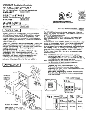 Installation Manual for the Federal Signal FSF201ST, FSF205ST and FSF104. Document No: SH24W75110-H1014, Rev: S040720a. 4 models including FSF201ST, FSF205ST, FSF104 and 1 additional variants. Hardware installation, terminal connections, and environmental requirements.