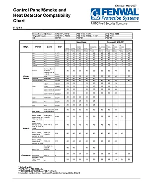 Compatibility Chart for the Fenwal Control Panel and Smoke Detector, published in 2007. Document No: F-70-63, Rev: AA. 12 models including CPD-7054, CPD-7054D, CPD-7051 and 9 additional variants. Panel and peripheral compatibility data, approved pairings, and replacement notes.