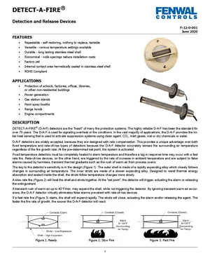Datasheet for the Fenwal DETECT-A-FIRE, published in 2020. Document No: F-12-0-001, Rev: BC. 16 models including 27121, 28021, 27120 and 13 additional variants. Detailed technical specifications, electrical ratings, and agency listings.