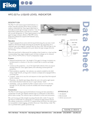 Datasheet for the Fike 70-1353 Series Liquid Level Indicator, published in 2005. Document No: C.1.05.01-2. 17 models including 70-1353-22, 70-1353-11, 70-1353-15 and 14 additional variants. Engineering specifications, wiring diagrams, and mounting dimensions.