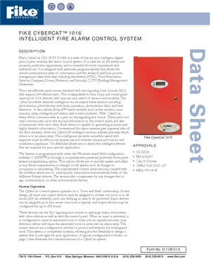 Datasheet for the Fike CyberCat 1016, published in 2005. Document No: D.1.08.01-5. 44 models including 10-064, 10-2472, 10-2528 and 41 additional variants. Product features, environmental operating limits, and compatibility data.