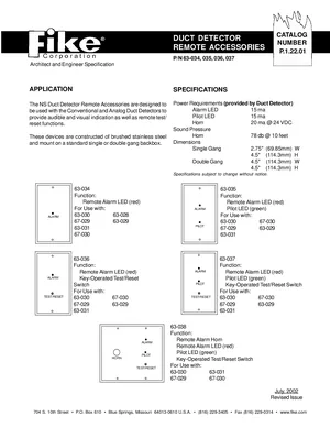 Datasheet for the Fike Duct Detector Remote Accessories, published in 2002. Document No: P.1.22.01. 11 models including 63-034, 63-035, 63-036 and 8 additional variants. Engineering specifications, wiring diagrams, and mounting dimensions.