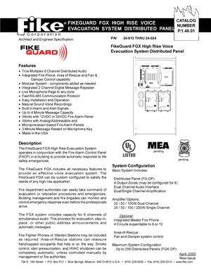 Datasheet for the FikeGuard FGX Distributed Panel, published in 2003. Document No: P.1.46.01. 17 models including FG-DPS25, FG-DPS50, FG-DPS100 and 14 additional variants. Engineering specifications, wiring diagrams, and mounting dimensions.