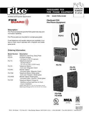 Datasheet for the FikeGuard FGX Fire Phone, published in 2003. Document No: P.1.47.01. 8 models including FG-FJ, FG-FH, FG-TC and 5 additional variants. Product features, environmental operating limits, and compatibility data.