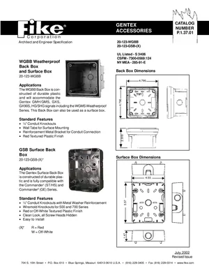 Datasheet for the Fike Gentex Accessories, published in 2002. Document No: P.1.37.01. Models 20-123-WGBB, 20-123-GSB-R and 20-123-GSB-W. Product features, environmental operating limits, and compatibility data.