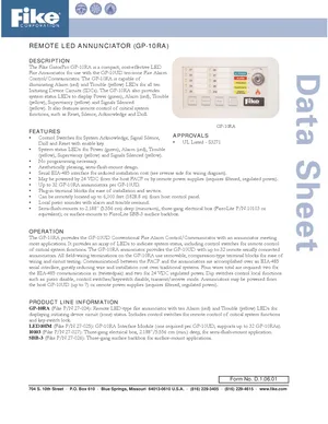 Datasheet for the Fike GP-10RA, published in 2005. Document No: D.1.06.01. 6 models including GP-10RA, GP-10UD, LED10IM and 3 additional variants. Product features, environmental operating limits, and compatibility data.