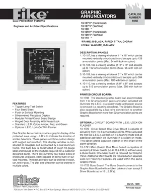 Datasheet for the Fike Graphic Annunciators, published in 1999. Document No: D1058-7. 61 models including 10-107H, 10-107V, 10-108 and 58 additional variants. Engineering specifications, wiring diagrams, and mounting dimensions.