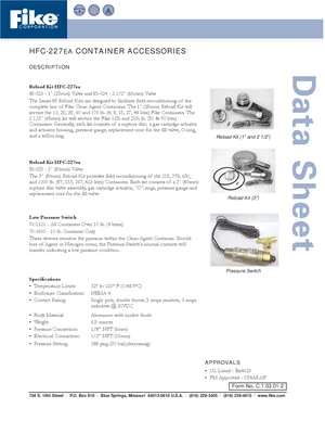 Datasheet for the Fike HFC-227EA Container Accessories, published in 2005. Document No: C.1.03.01-2. 12 models including 85-023, 85-024, 85-025 and 9 additional variants. Product features, environmental operating limits, and compatibility data.