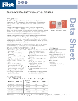 Datasheet for the Fike Low Frequency Evacuation Signals, published in 2004. Document No: P.1.25.01. 32 models including 20-123-142, 20-123-143, 20-123-27 and 29 additional variants. Detailed technical specifications, electrical ratings, and agency listings.