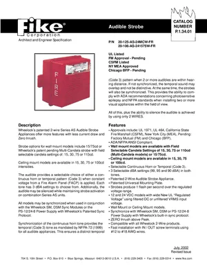 Datasheet for the Fike Series AS Audible Strobe, published in 2002. Document No: P.1.34.01. Models 20-125-AS-24MCW-FR and 20-106-AS-241575W-FR. Engineering specifications, wiring diagrams, and mounting dimensions.