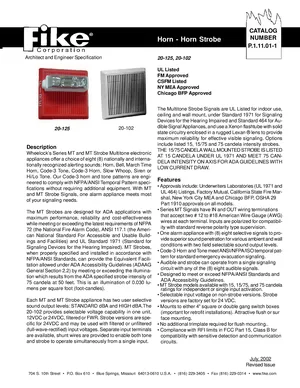 Datasheet for the Fike Series MT Horn and Horn Strobes, published in 2002. Document No: P.1.11.01-1. Models 20-125, 20-100 and 20-102. Engineering specifications, wiring diagrams, and mounting dimensions.