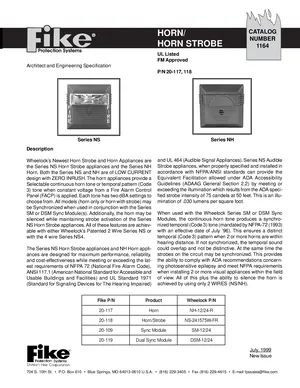 Datasheet for the Fike Series NS and NH Appliances, published in 1999. Document No: D1164. 8 models including 20-117, 20-118, 20-109 and 5 additional variants. Detailed technical specifications, electrical ratings, and agency listings.