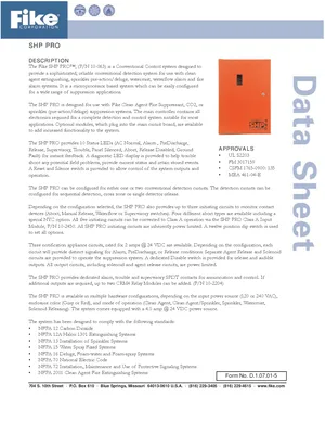 Datasheet for the Fike SHP PRO, published in 2005. Document No: D.1.07.01-5. 8 models including 10-063, 10-2450, 10-2204 and 5 additional variants. Detailed technical specifications, electrical ratings, and agency listings.